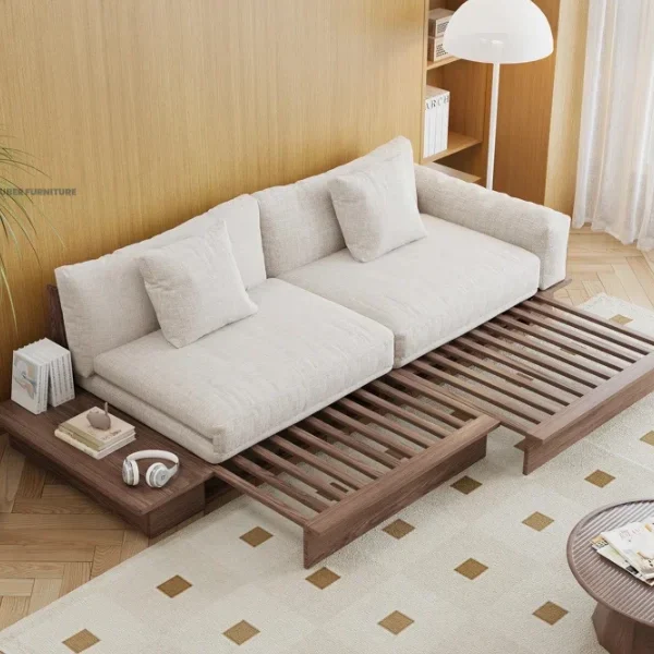 Japandi Solid Wood Sofa Bed with Liftable Armrest Storage Box