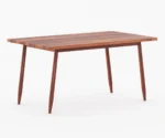 The dining table is rectangular with a wooden finish, showcasing natural wood grain patterns. It has clean, straight lines, which give it a sleek and contemporary appearance.