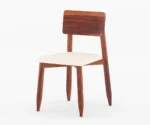 The set includes six chairs, each made from the same wood as the table. The chairs have simple, angled legs and a low backrest, also highlighting the natural wood grain. The seats are cushioned with a light-colored fabric, offering comfort and contrast to the rich wood tones.