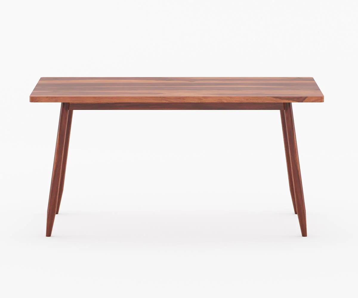 The dining table is rectangular with a wooden finish, showcasing natural wood grain patterns. It has clean, straight lines, which give it a sleek and contemporary appearance.
