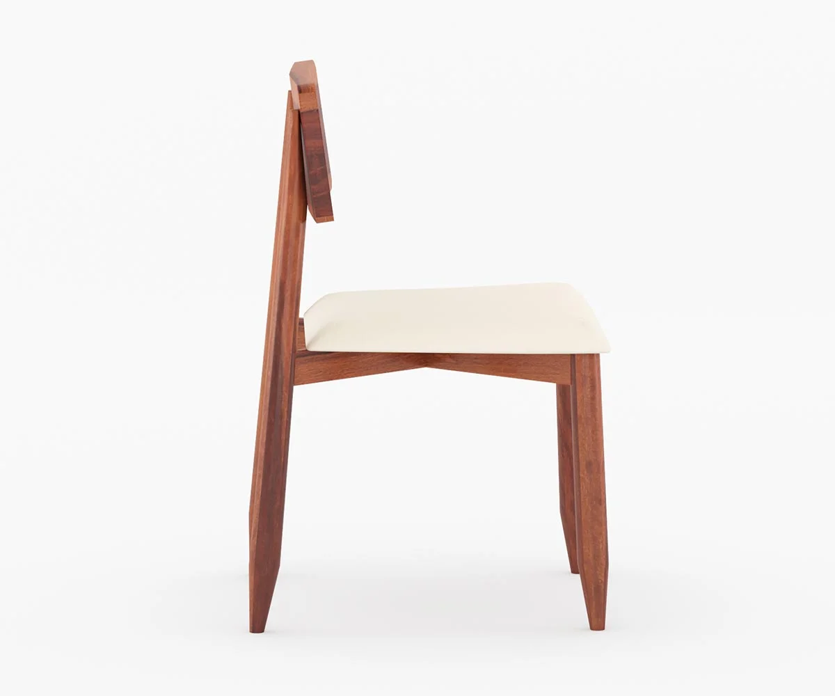 The set includes six chairs, each made from the same wood as the table. The chairs have simple, angled legs and a low backrest, also highlighting the natural wood grain. The seats are cushioned with a light-colored fabric, offering comfort and contrast to the rich wood tones.