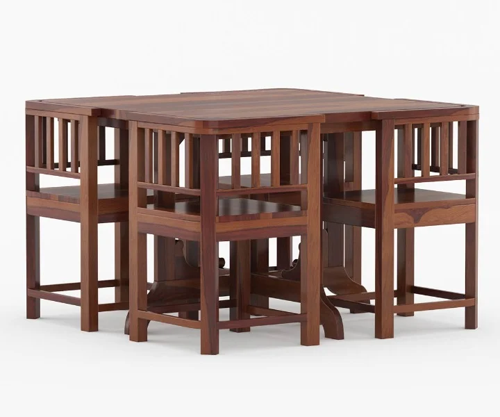 This remarkable set features a compact and space-saving design, making it an exquisite choice for smaller homes or apartments. Comprised of a magnificent square dining table and four matching chairs, all crafted from high-quality Sheesham wood, this  is undoubtedly an opulent addition to any dining area. The compact and space-saving design of this dining set is what makes it an absolute gem for smaller spaces. The square table is a marvelously befitting feature for more small dining areas, while the chairs can be conveniently stored beneath the table when not in use, saving valuable floor space. The versatility of the Cohoon 4-seater dining set is unparalleled, given its compact design, which makes it perfect for small apartments or homes. This, however, does not limit its suitability for larger spaces, where it can effortlessly transform into a cozy and intimate dining area.