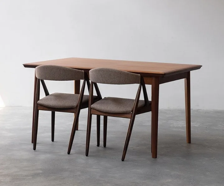 The chair seats are flat, with a slight curve on the backrest to provide ergonomic support. The wood and finish match the table, creating a cohesive lo The dining set is ideal for a modern or contemporary home, yet it carries a timeless appeal due to its classic wood finish. The set is placed on a light-colored geometric rug, which contrasts beautifully with the dark wood, making the furniture the focal point of the room. The surrounding décor, such as the potted plant and wall art, enhances the modern aesthetic of the space.