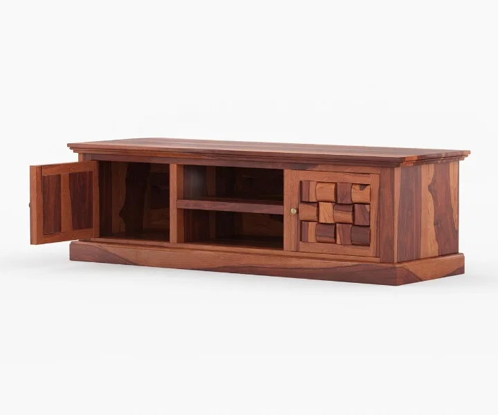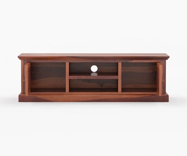 1. Miller TV unit is designed in such a way that it encompasses five drawers of equal dimension and one open shelf to place the set-top box in the midsection.