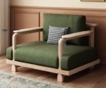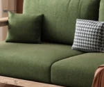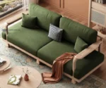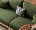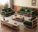 Upholstered in rich olive green fabric, the cushions provide a striking yet soothing contrast to the pale wood. The set includes a spacious 3-seater, a cozy 2-seater, and a pair of comfortable single-seater sofas—ideal for family seating and hosting guests.