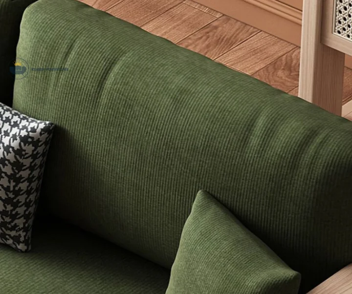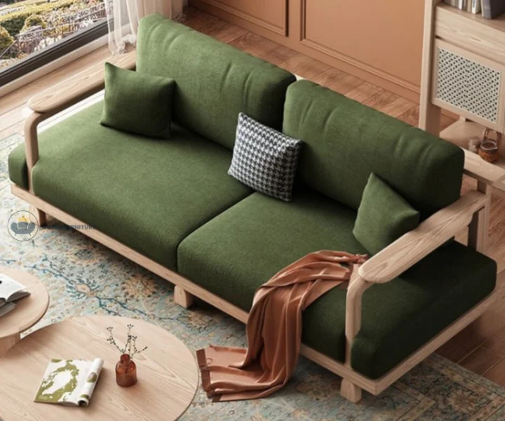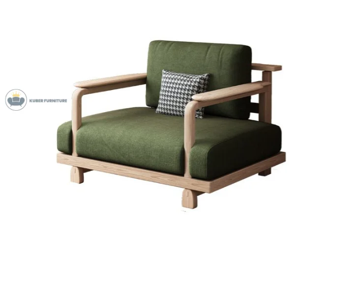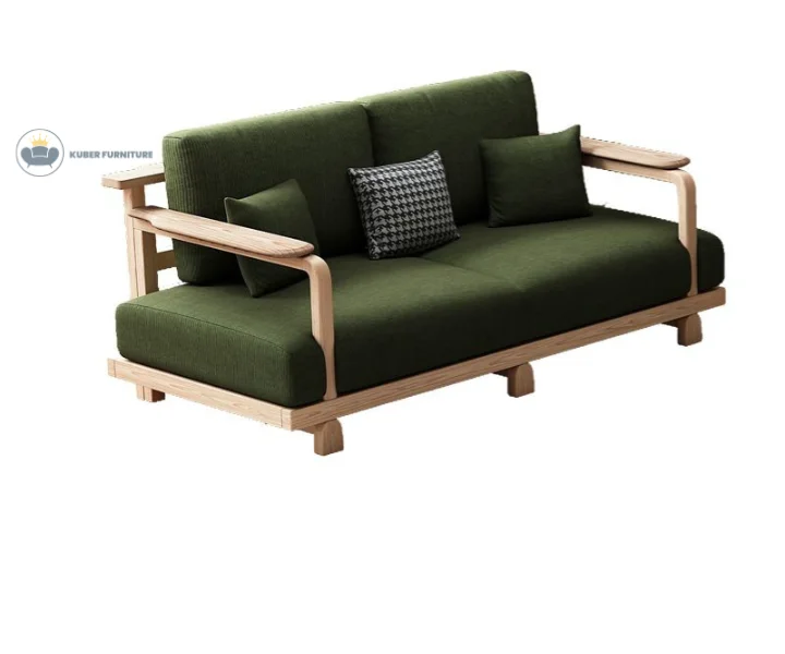 Upholstered in rich olive green fabric, the cushions provide a striking yet soothing contrast to the pale wood. The set includes a spacious 3-seater, a cozy 2-seater, and a pair of comfortable single-seater sofas—ideal for family seating and hosting guests.