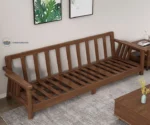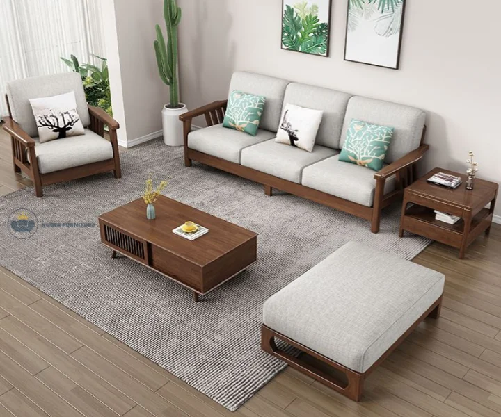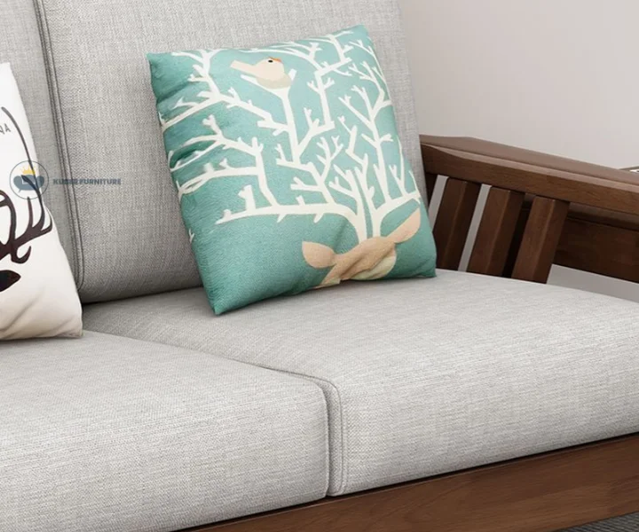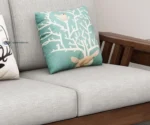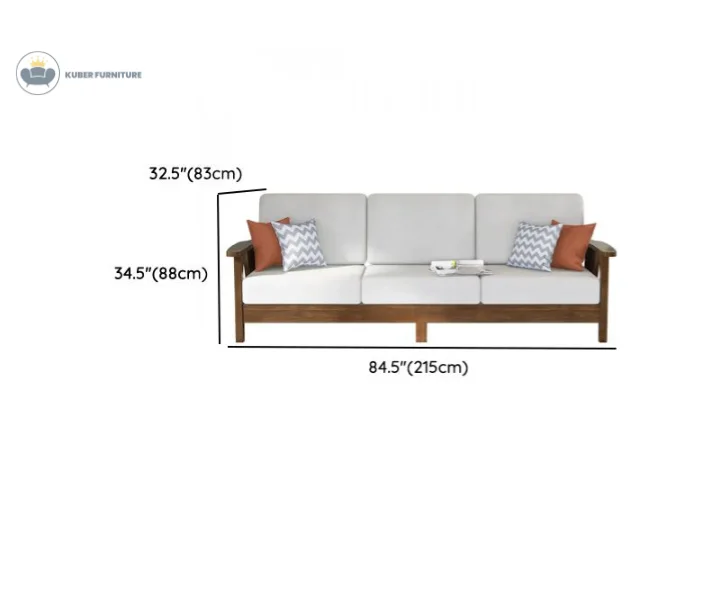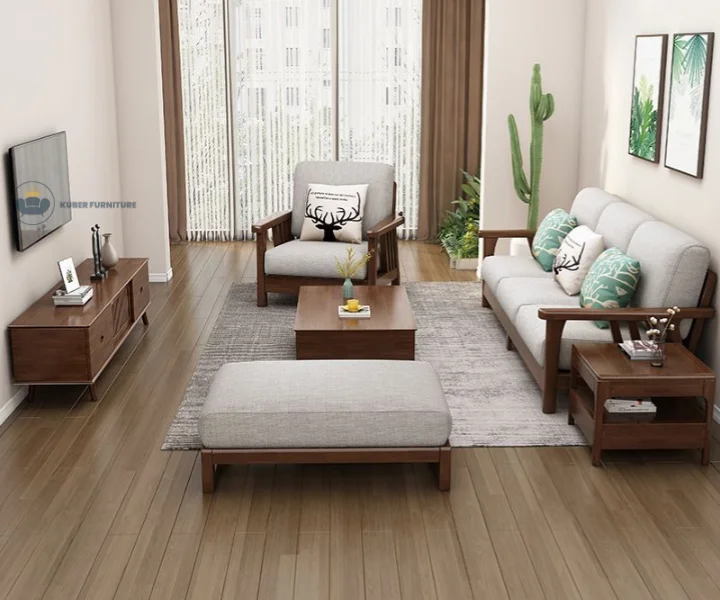 Add timeless sophistication to your living room with this elegant solid wood sofa set. Featuring rich walnut-toned wooden frames, this set includes a 3-seater, a 2-seater, and a single-seater sofa — all paired with plush light gray cushions for a balanced blend of comfort and style. Decorative throw pillows with nature-inspired prints elevate the cozy ambiance, while the matching center table, side table, and TV unit complete the unified look.
