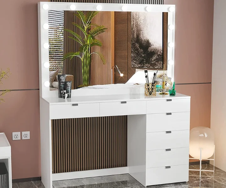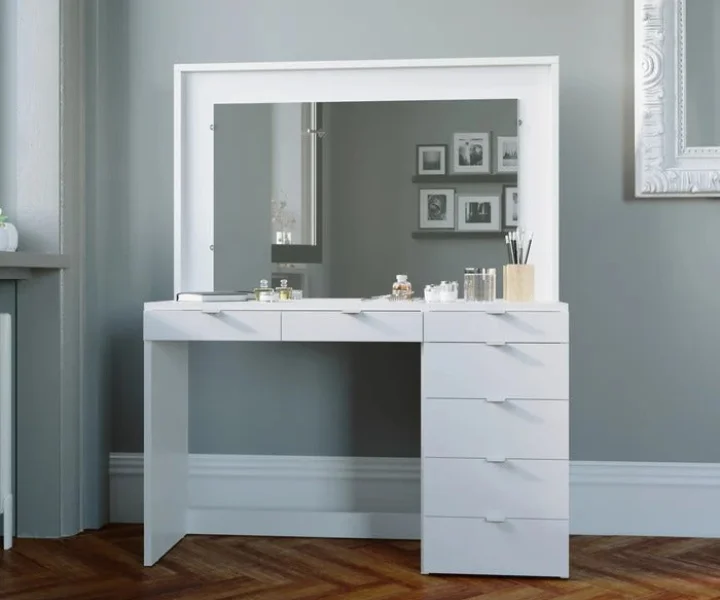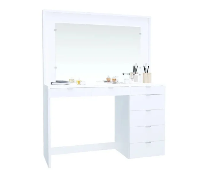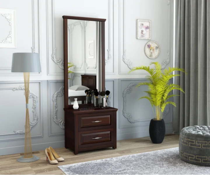 The Engineered Wood Dressing Table is a stunning piece of furniture designed to enhance the aesthetics of any bedroom. Made with premium quality engineered wood, this dressing table is a perfect combination of style and functionality. The beautiful finish gives it a contemporary look that is sure to catch the eye. The table comes with a large mirror and ample storage space, including a cabinet and drawers, which make it an ideal place to store all your cosmetics and accessories. The cabinet has a shelf that can be adjusted to your preference, making it a versatile addition to your room. The drawers have smooth sliders and provide ample storage space for all your essentials.